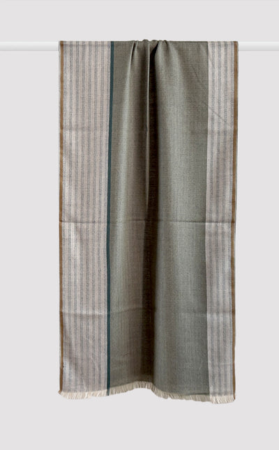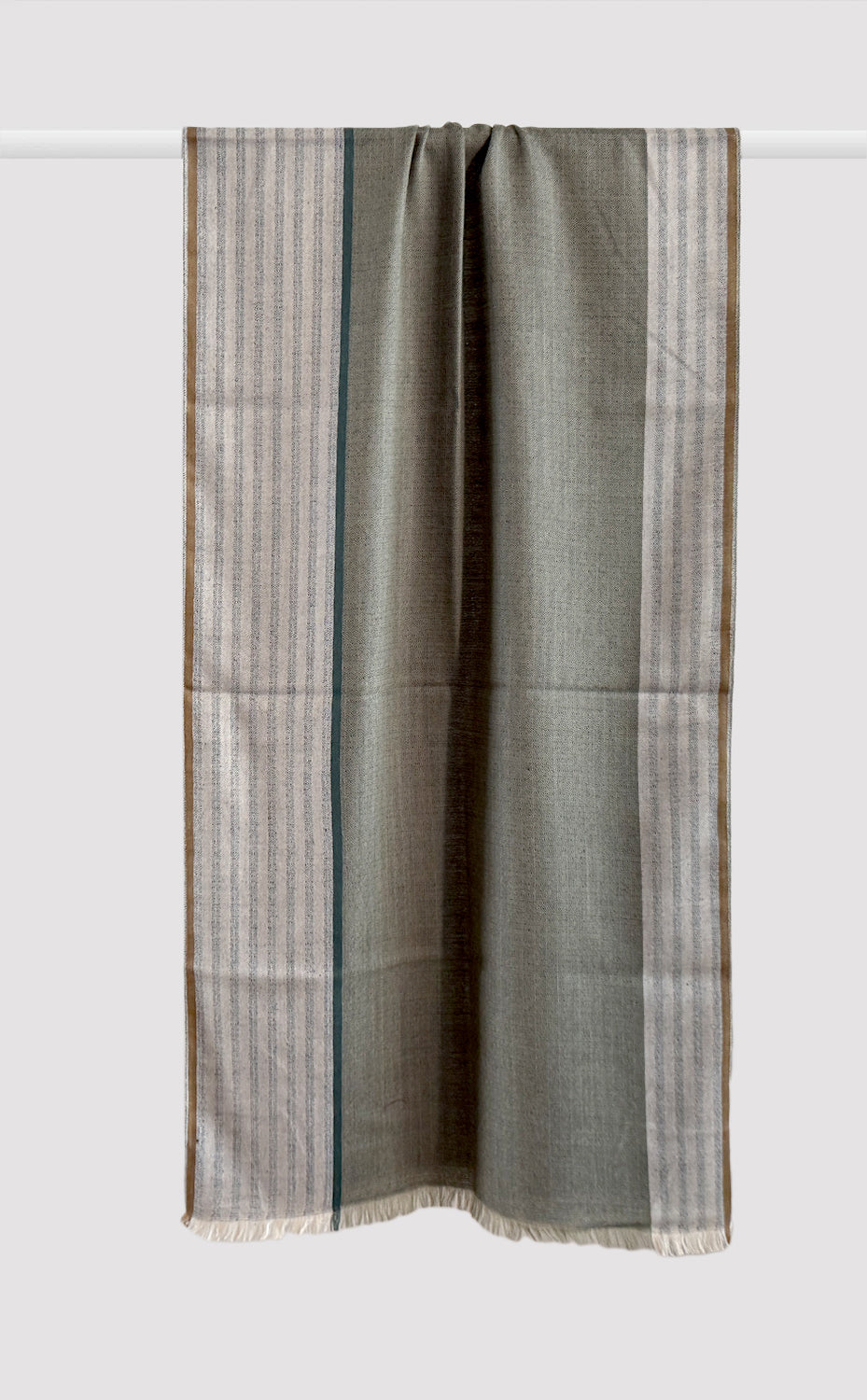 Regular price Rs. 4,800.00This is a muffler made from merino wool featuring a vibrant striped pattern in shades of olive and beige. The alternating wide and narrow stripes give it a dynamic and elegant look. The muffler is lightweight, soft, and warm, making it perfect for both casual and formal occasions