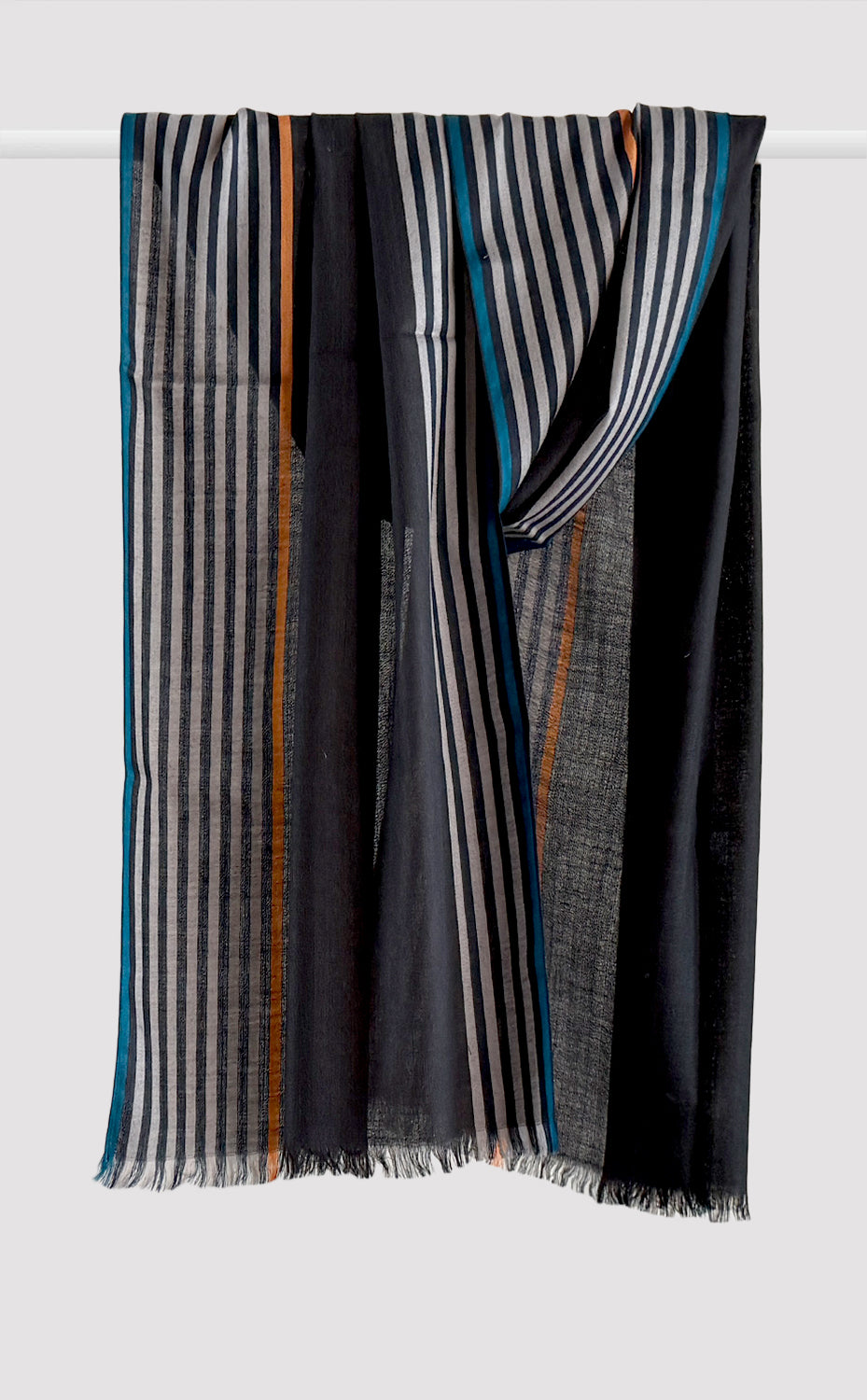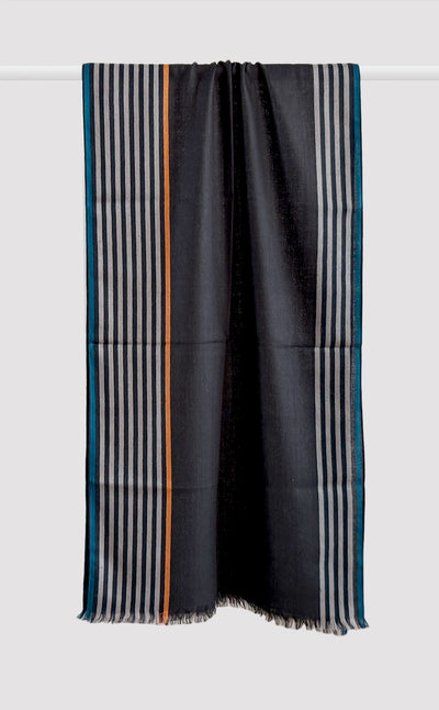 Regular price Rs. 4,800.00This is a muffler made from merino wool featuring a vibrant striped pattern in shades of blue and black. The alternating wide and narrow stripes give it a dynamic and elegant look. The muffler is lightweight, soft, and warm, making it perfect for both casual and formal occasions