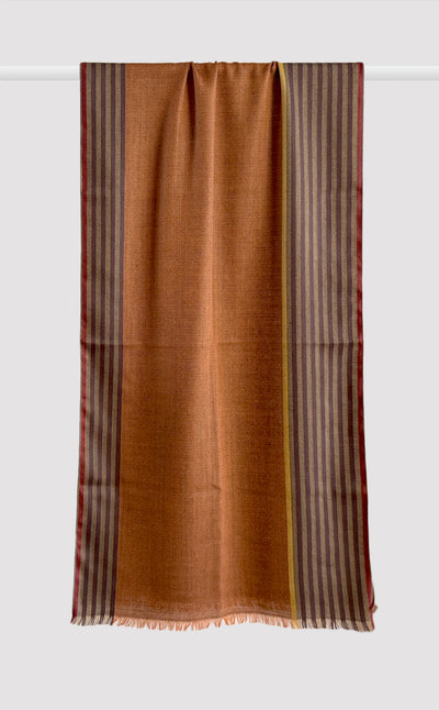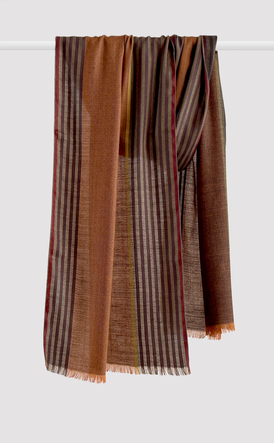 Regular price Rs. 4,800.00This is a muffler made from merino wool featuring a vibrant striped pattern in shades of chestnut and clay. The alternating wide and narrow stripes give it a dynamic and elegant look. The muffler is lightweight, soft, and warm, making it perfect for both casual and formal occasions