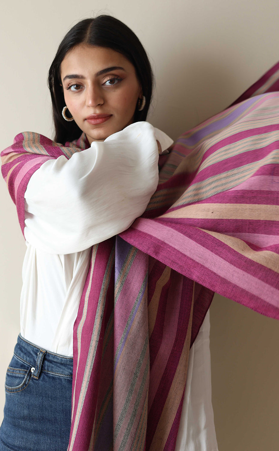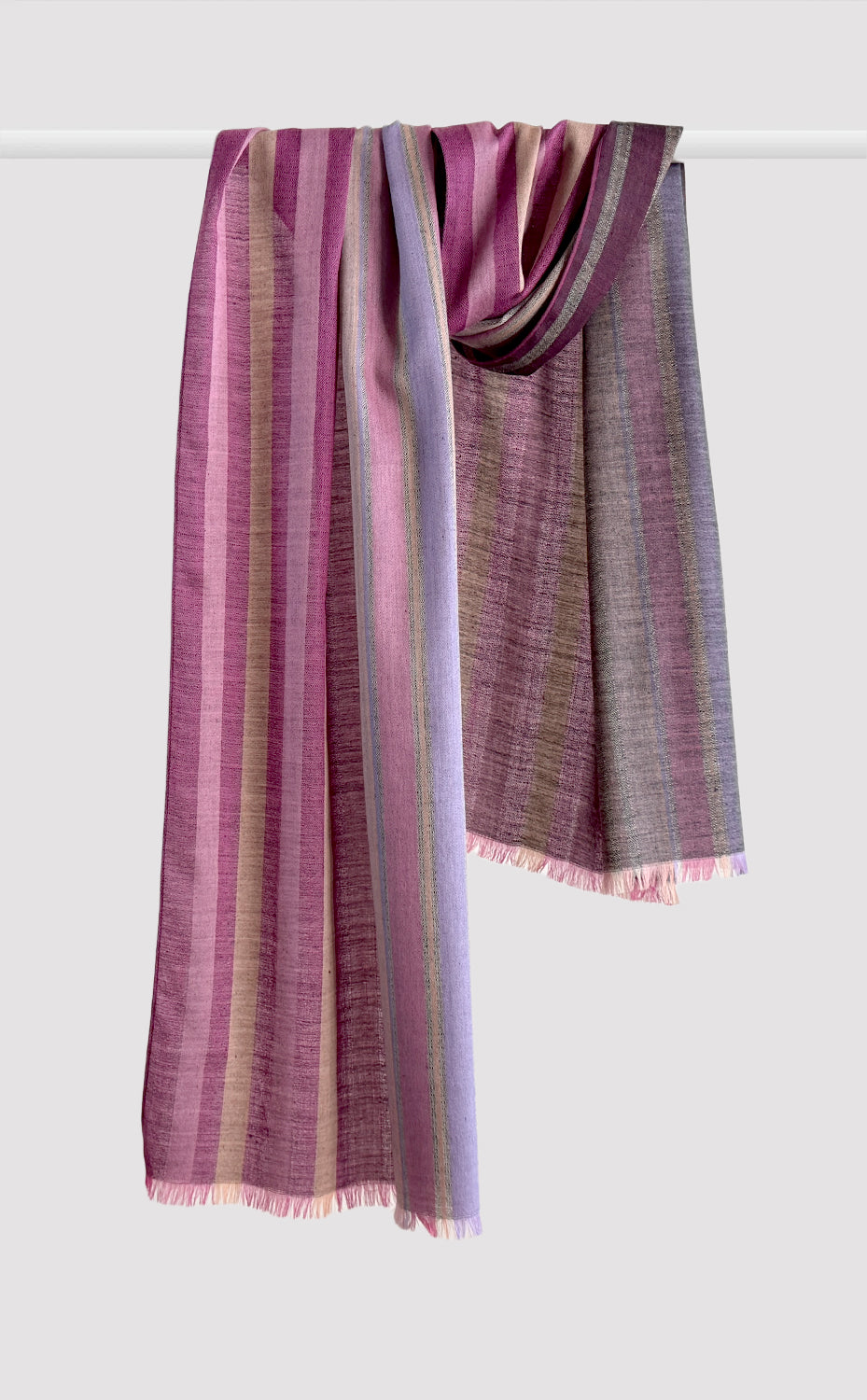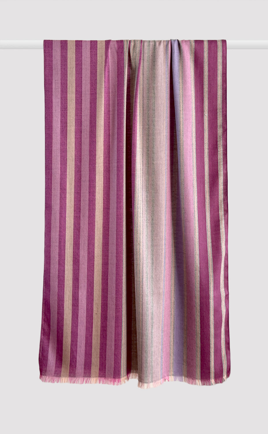 Regular price Sale price Rs. 6,000.00This elegant woollen shawl features a timeless striped design in various shades of pink and fuschia. Made from ultra high-quality wool, it offers warmth and comfort while maintaining a lightweight feel. Its versatile design makes it suitable for both casual and formal wear, providing a chic accent to any outfit. The evenly spaced vertical stripes and the slightly frayed edges add a touch of sophistication and texture. Ideal for chilly days or as a stylish accessory throughout the year