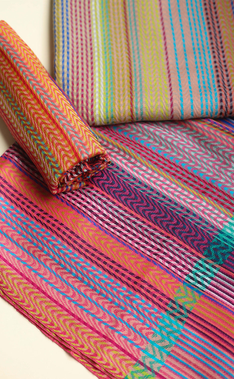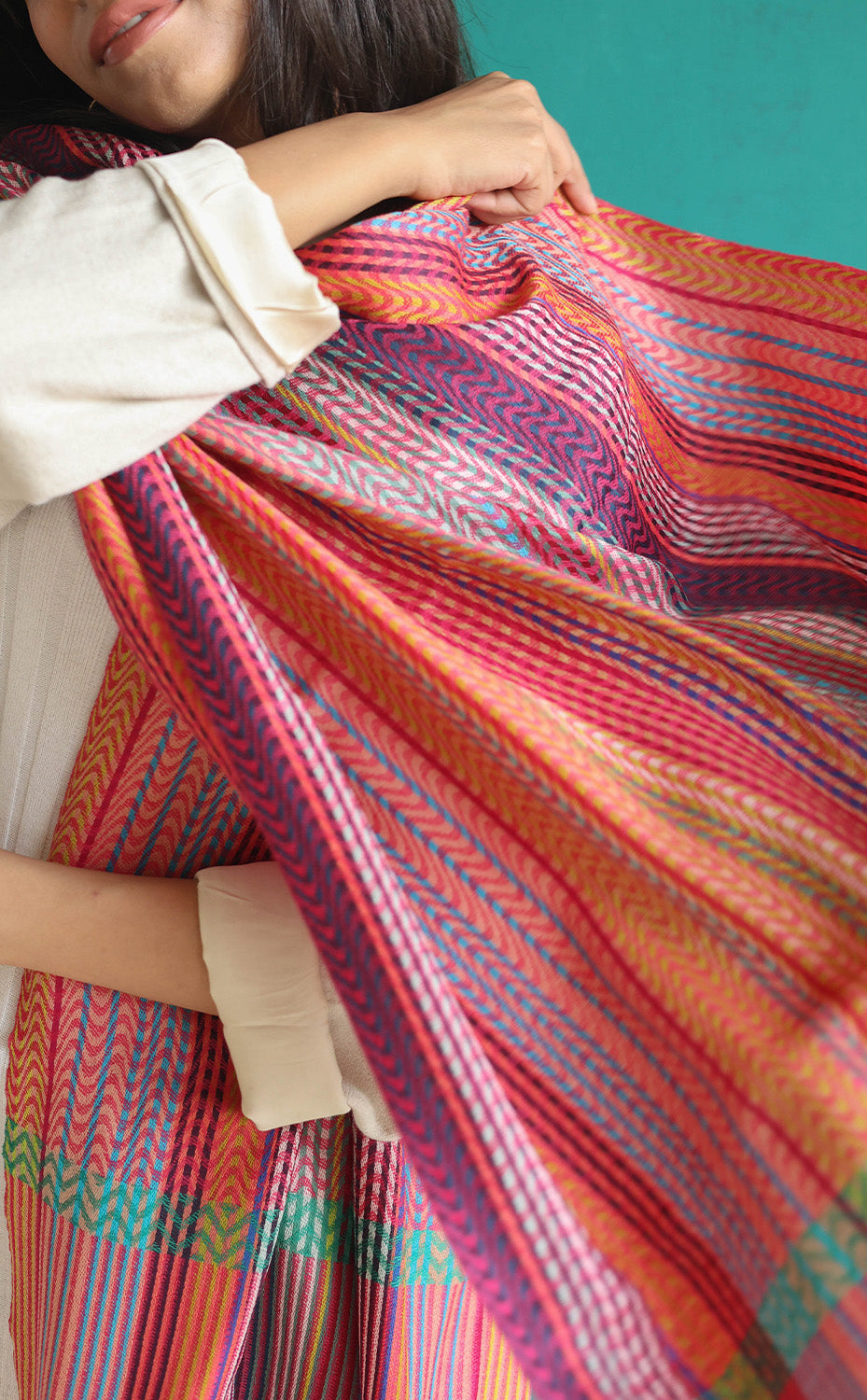 Regular price Rs. 4,800.00This design creates a visually captivating and harmonious blend of vibrant colours and texture. Featuring a series of asymmetrical stripes in hues seamlessly woven together adding depth and dimension to the shawl. Each piece is crafted using fine merino wool with a textured feel perfect for winter