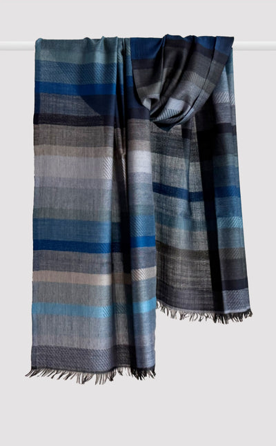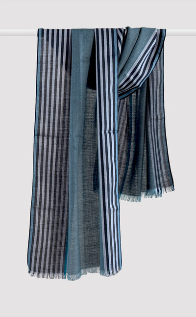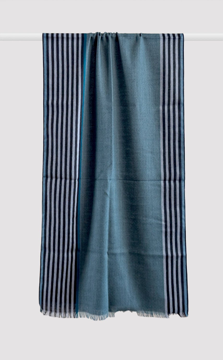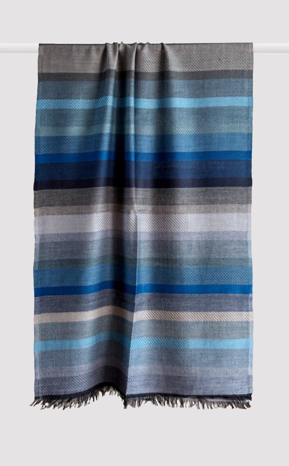 Regular price Sale price Rs. 6,000.00This elegant woollen shawl features a timeless striped design in various shades of blue and subtle neutrals. Made from ultra high-quality wool, it offers warmth and comfort while maintaining a lightweight feel. Its versatile design makes it suitable for both casual and formal wear, providing a chic accent to any outfit. The evenly spaced vertical stripes and the slightly frayed edges add a touch of sophistication and texture. Ideal for chilly days or as a stylish accessory throughout the year