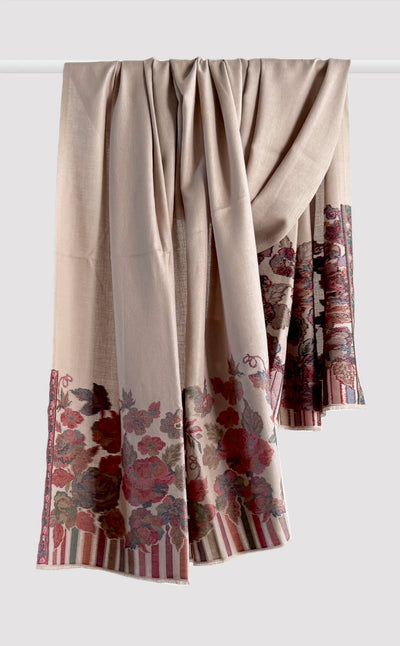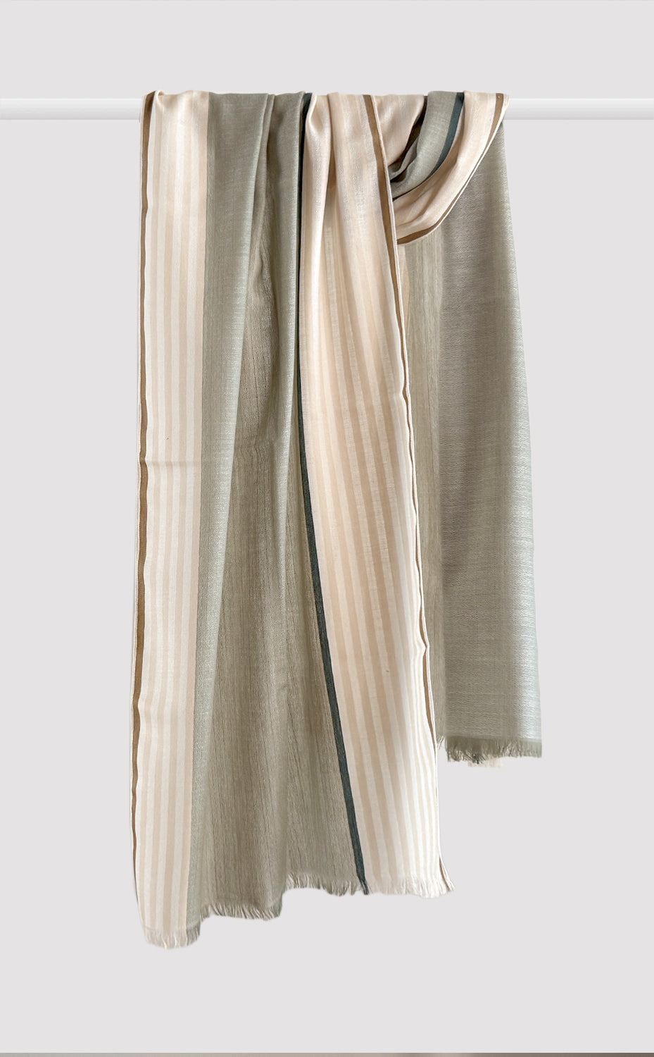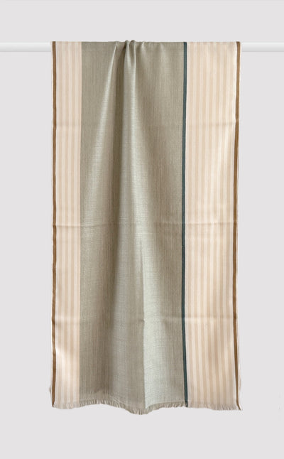 Regular price Sale price Rs. 6,000.00This elegant woollen shawl features a timeless striped design in various shades of beige and subtle neutrals. Made from ultra high-quality wool, it offers warmth and comfort while maintaining a lightweight feel. Its versatile design makes it suitable for both casual and formal wear, providing a chic accent to any outfit. The evenly spaced vertical stripes and the slightly frayed edges add a touch of sophistication and texture. Ideal for chilly days or as a stylish accessory throughout the year