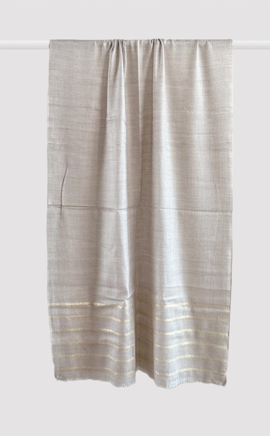 Regular price Rs. 6,600.00Luxurious fine wool stole in grey tone with beautiful subtle golden zari stripes. Fine wool blended with silk gives it an ultra soft & cosy feel