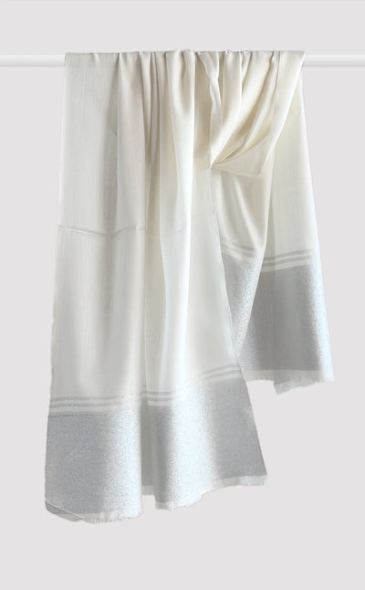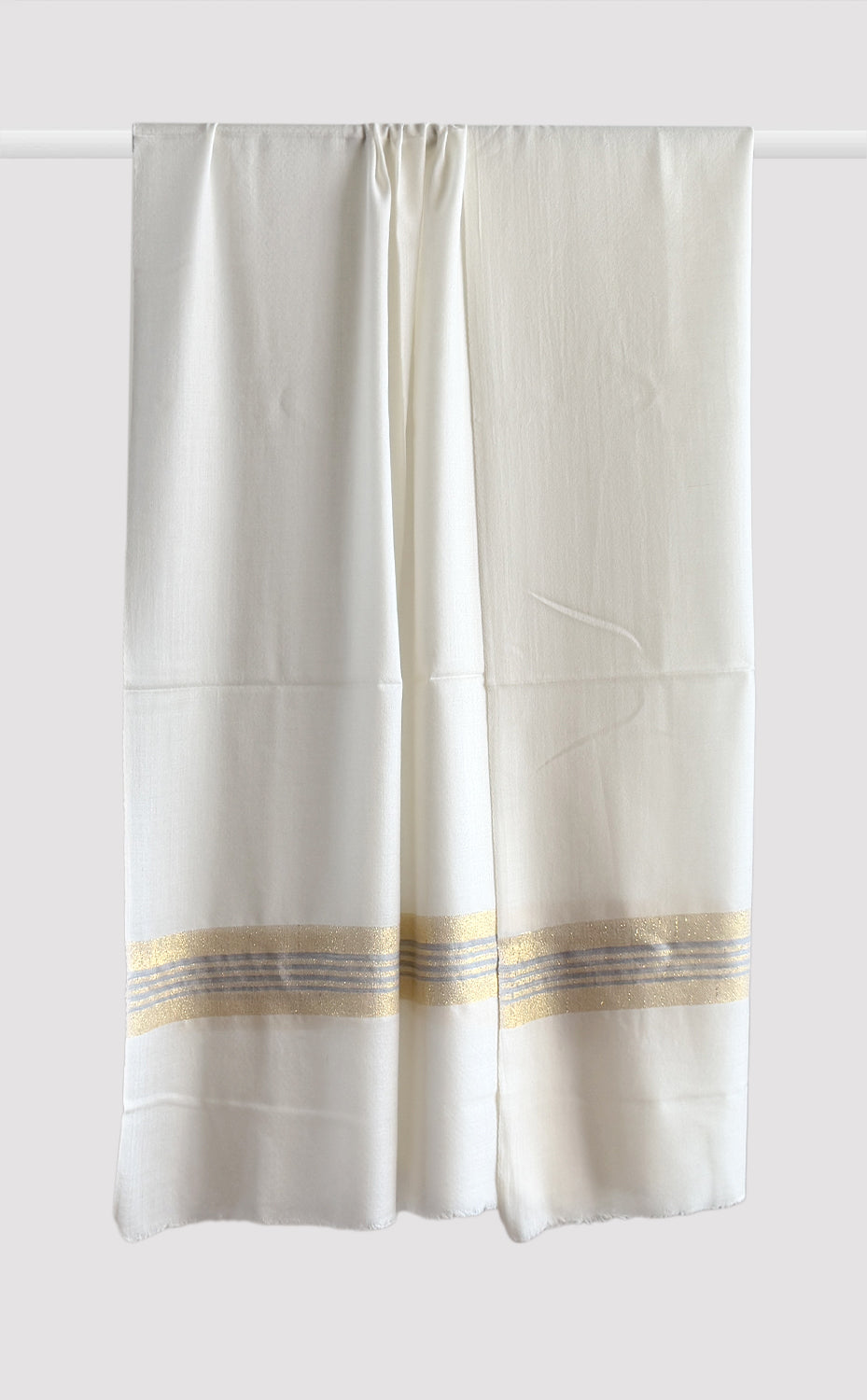 Luxurious fine wool stole in lunar white tone with beautiful & broad zari border. Fine wool blended with silk gives it an ultra soft & cosy feel