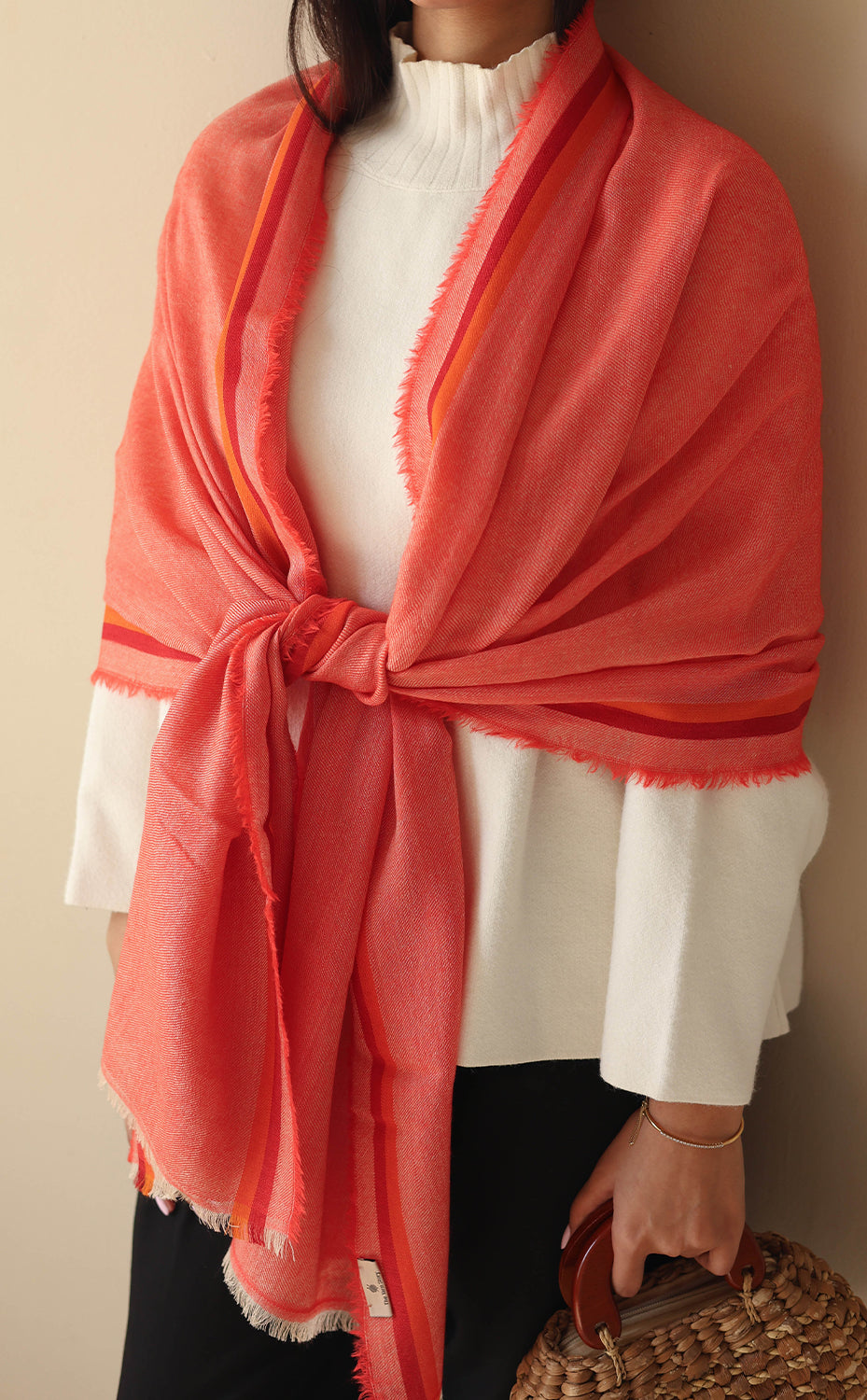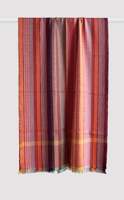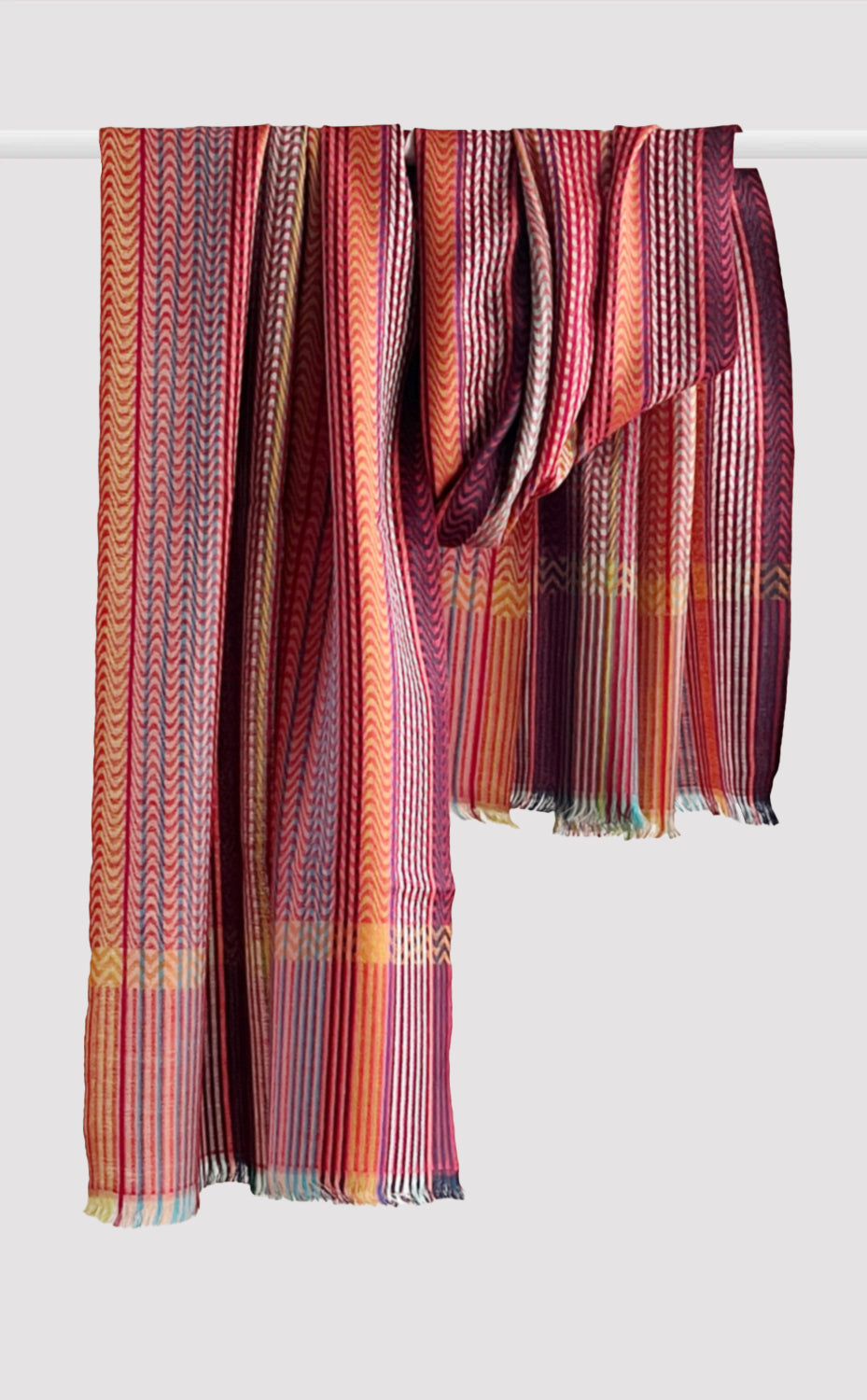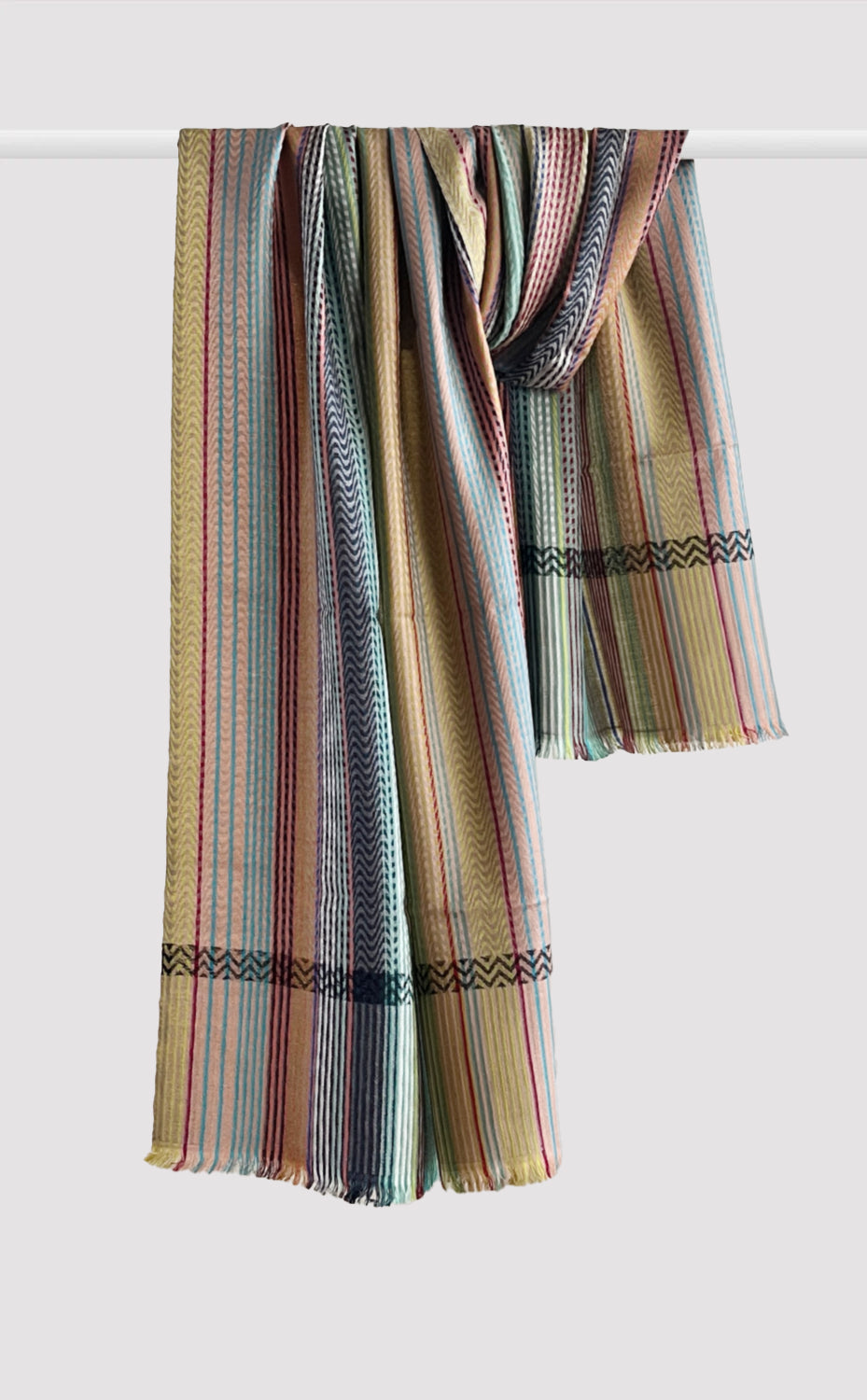 Regular price Rs. 4,800.00This design creates a visually captivating and harmonious blend of vibrant colours and texture. Featuring a series of asymmetrical stripes in hues seamlessly woven together adding depth and dimension to the shawl. Each piece is crafted using fine merino wool with a textured feel perfect for winter