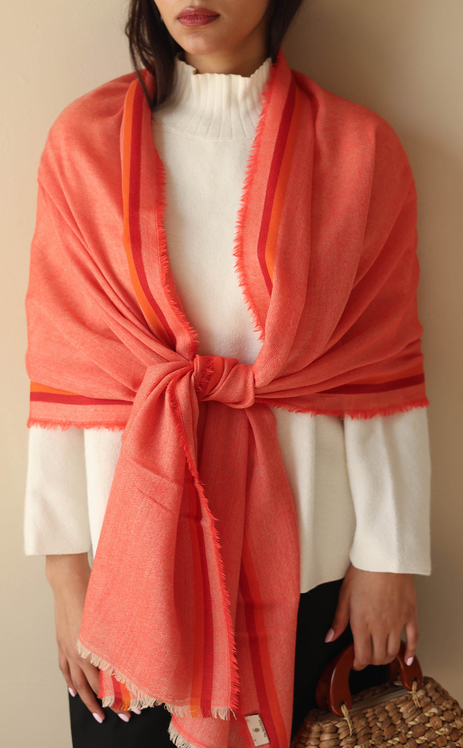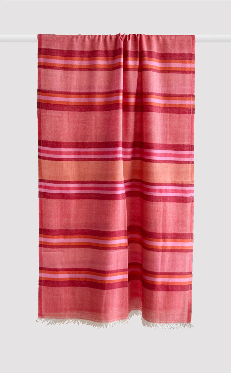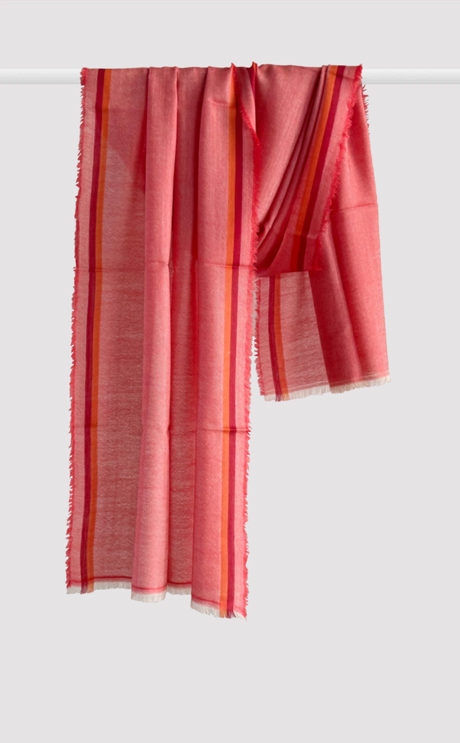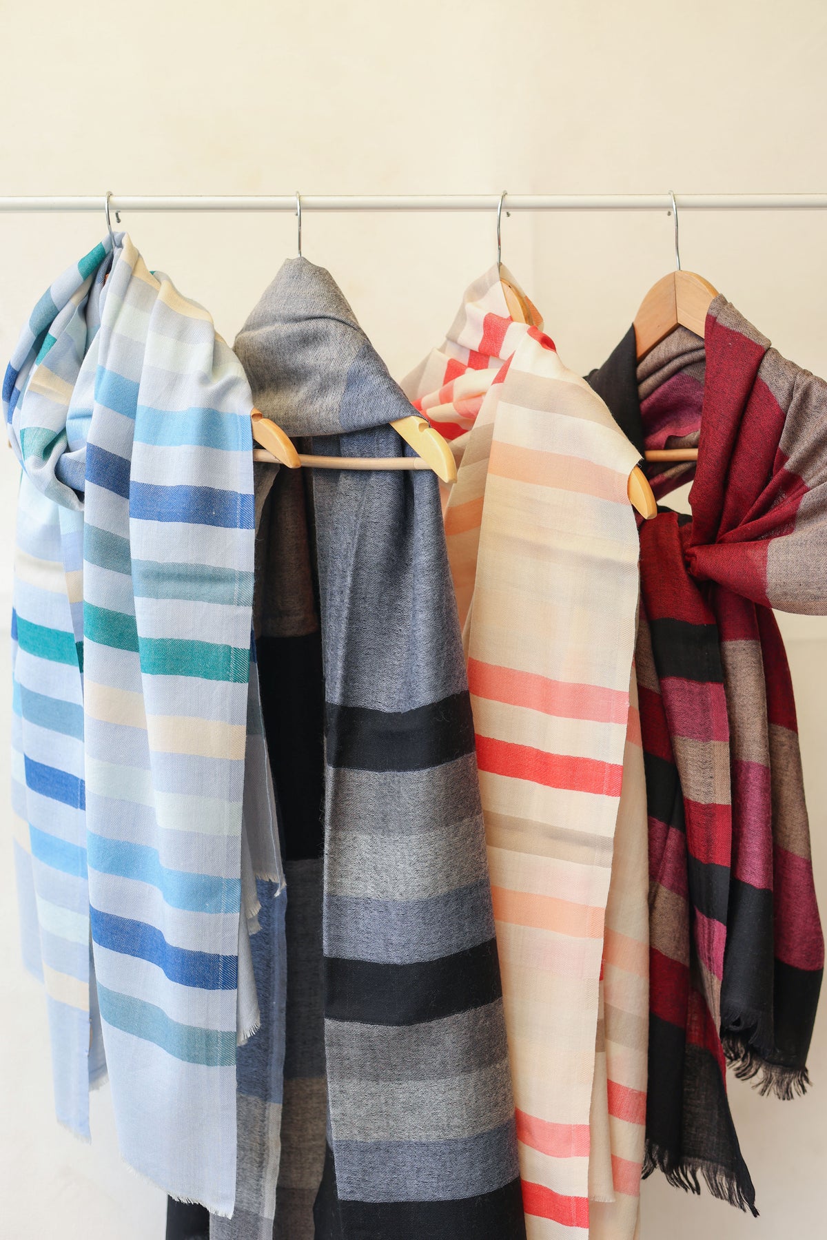 Regular price Rs. 4,800.00This design creates a visually captivating and harmonious blend of vibrant colours and texture. Featuring a series of asymmetrical stripes in hues seamlessly woven together adding depth and dimension to the shawl. Each piece is crafted using fine merino wool with a textured feel perfect for winter