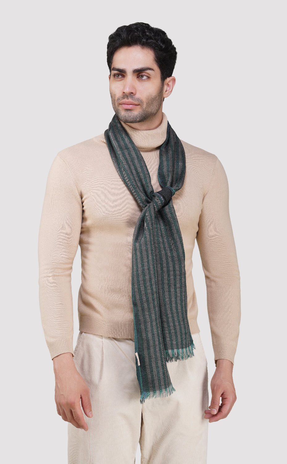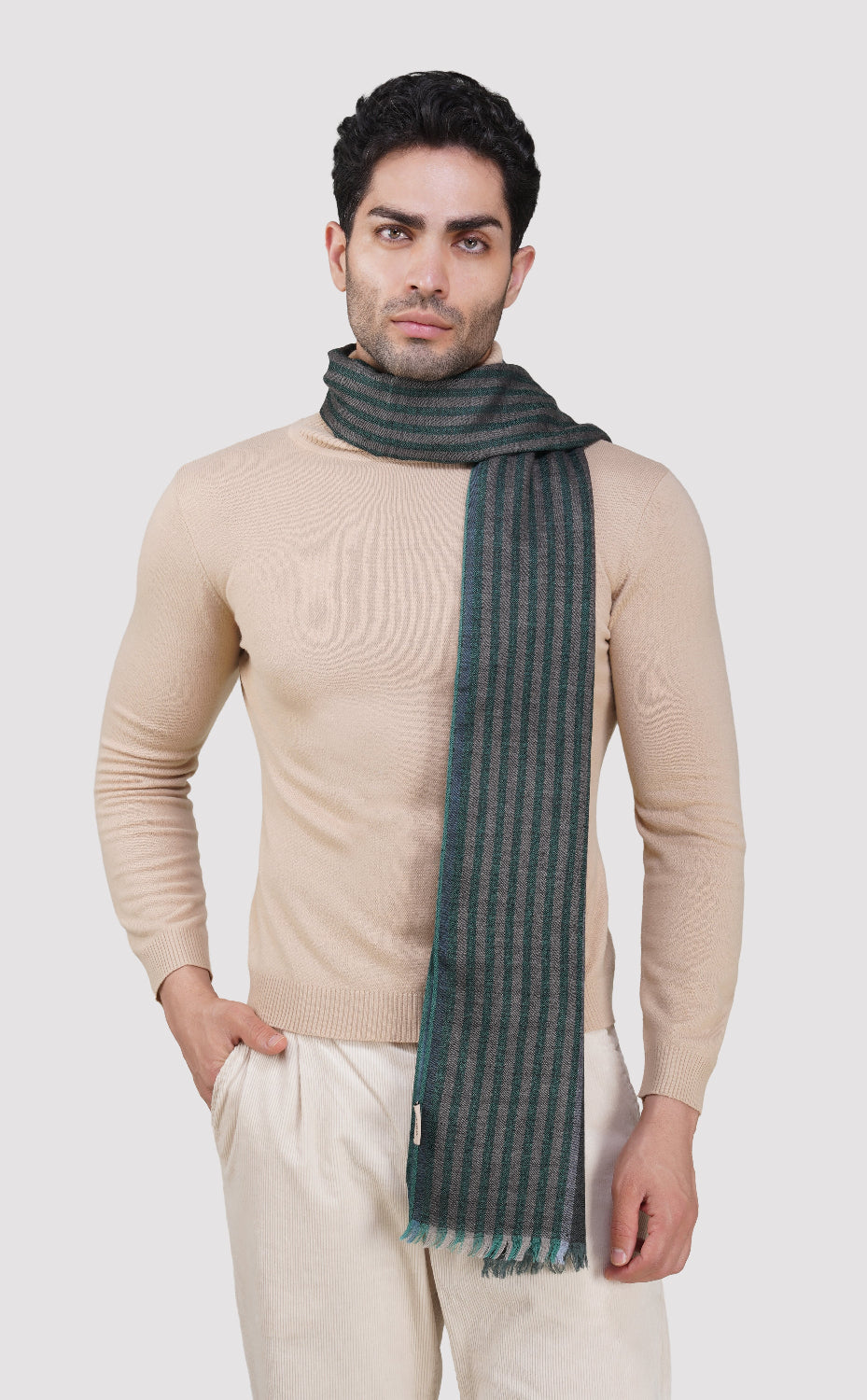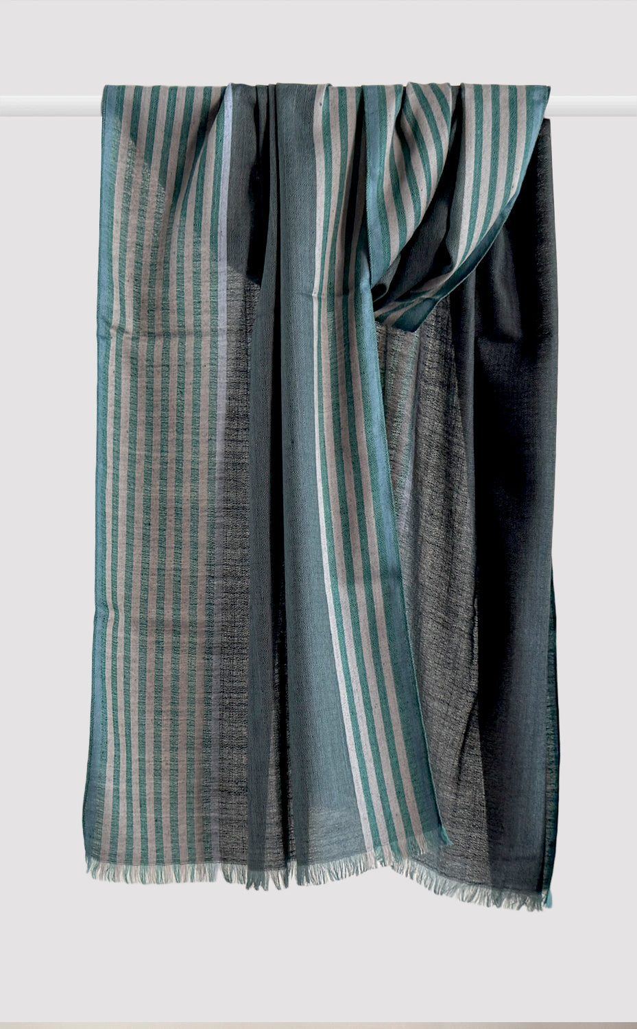 Regular price Rs. 4,800.00This is a muffler made from merino wool featuring a vibrant striped pattern in shades of teal and turquoise. The alternating wide and narrow stripes give it a dynamic and elegant look. The muffler is lightweight, soft, and warm, making it perfect for both casual and formal occasions
