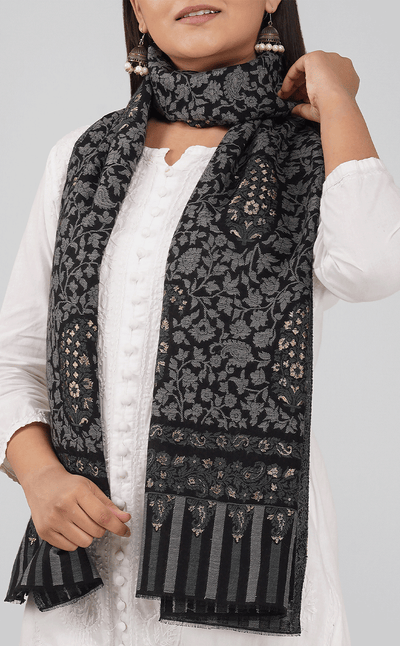 Regular price Rs. 11,400.00Luxurious fine wool stole in a festive black and grey shade. Zari on one side and an intricate ikat striped design on the other. The perfect accessory for the festive winter season that will elevate all your outfits