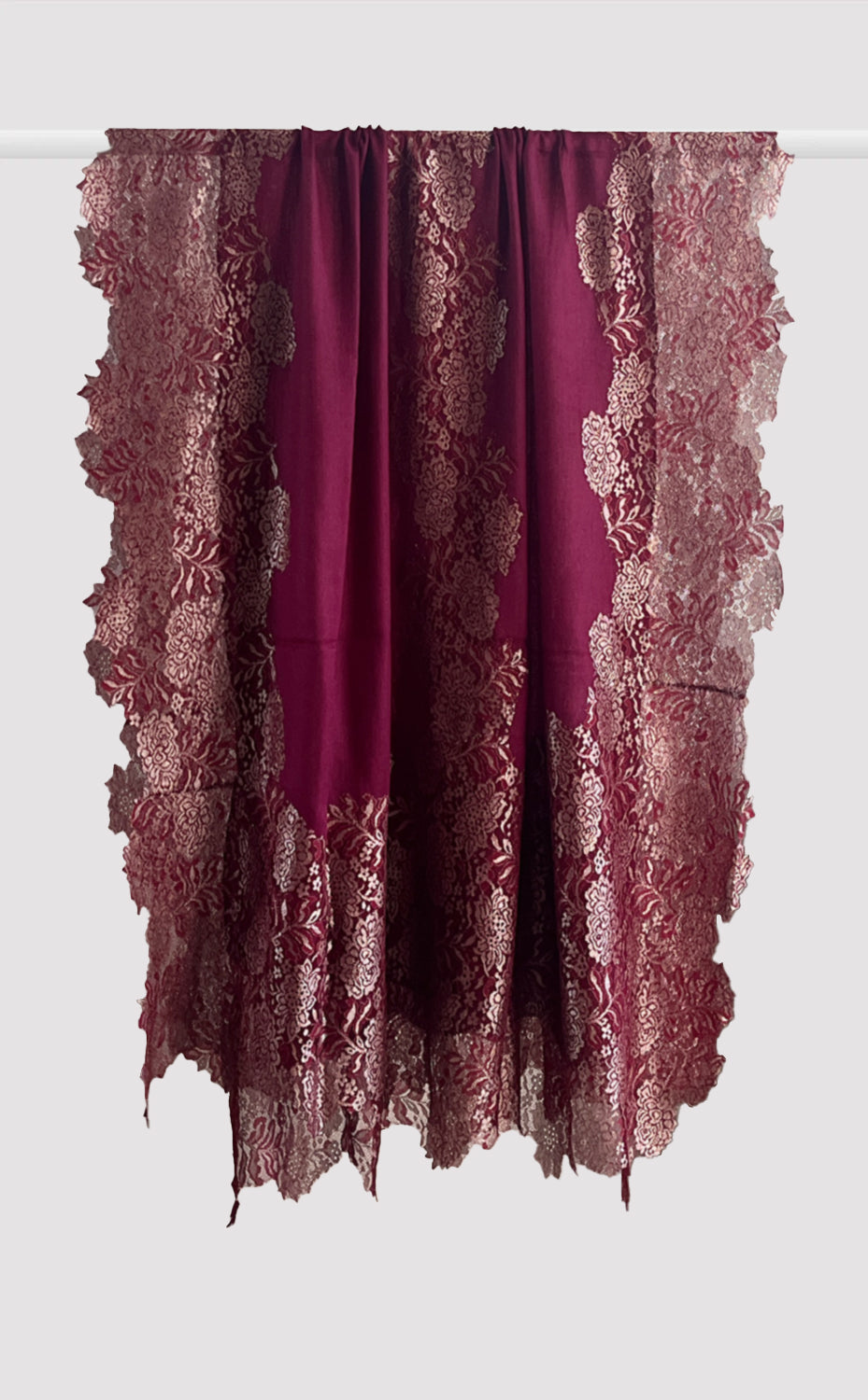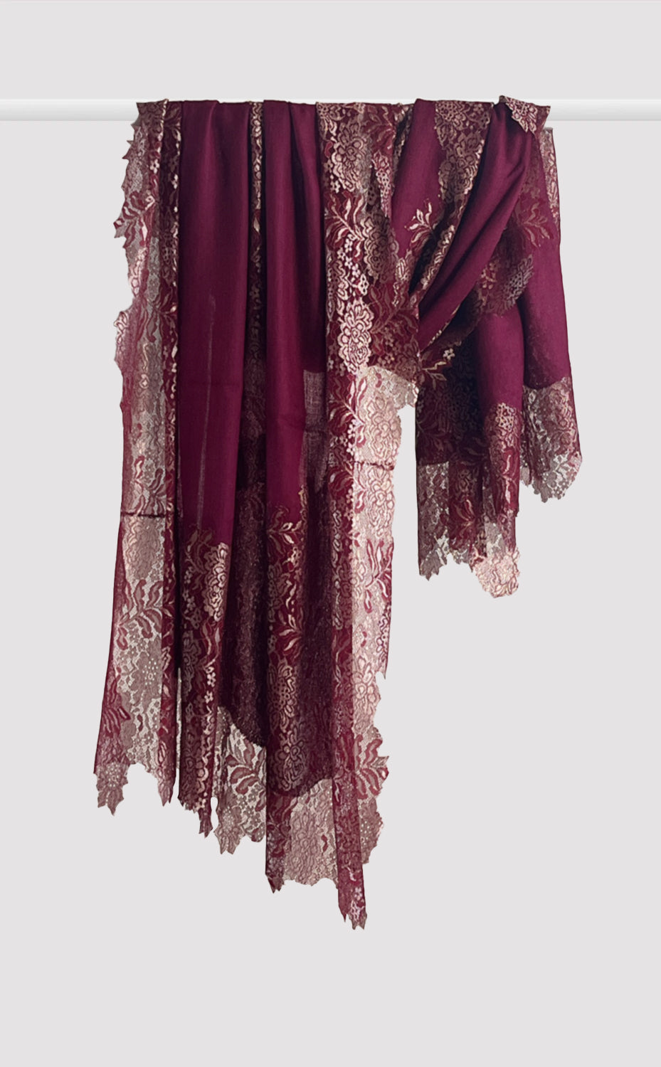 Regular price Rs. 9,000.00Luxurious fine wool shawl in a rich vintage mulberry color with french chantilly lace and zari details. A lovely piece for a formal evening out