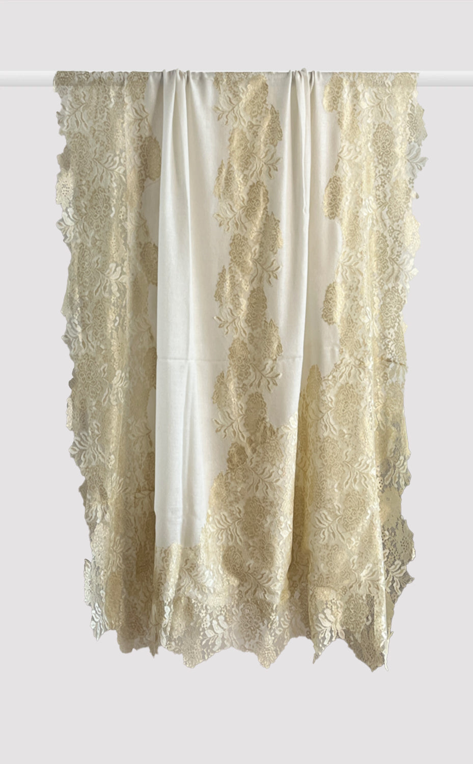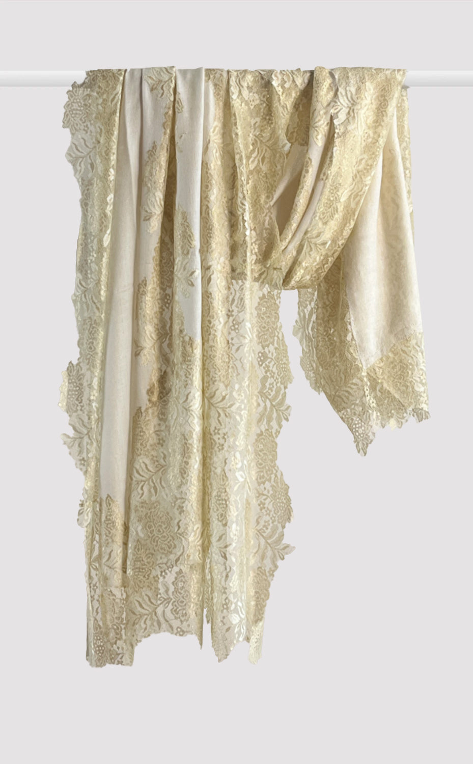 Regular price Rs. 9,000.00Luxurious fine wool shawl in a rich vintage white color with french chantilly lace and zari details. A lovely piece for a formal evening out