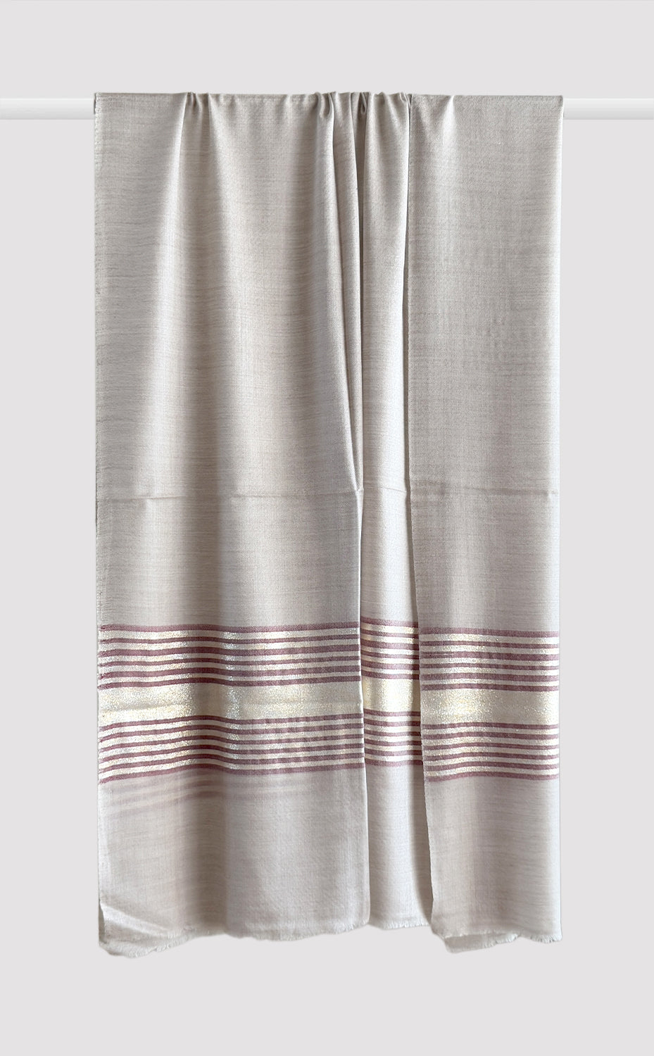 Luxurious fine wool stole in cream tone with beautiful subtle brown zari stripes. Fine wool blended with silk gives it an ultra-soft & cosy feel