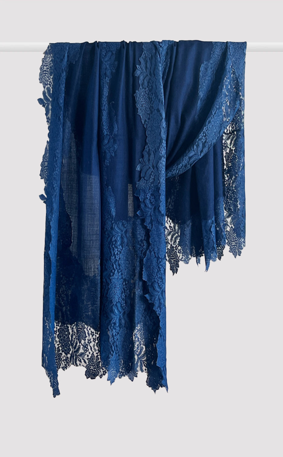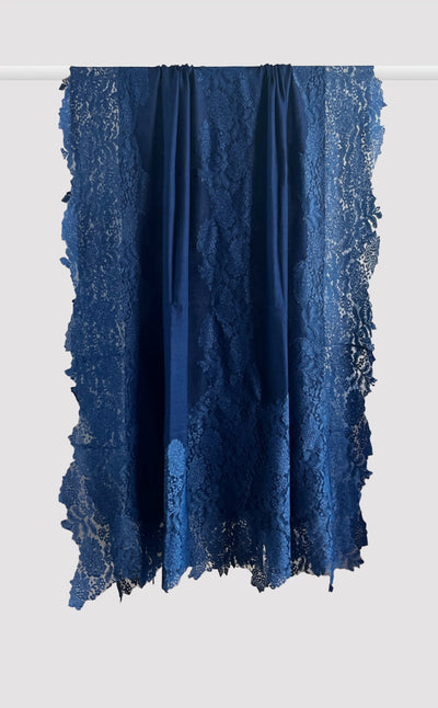Regular price Rs. 8,160.00Luxurious fine wool shawl in a soft rich deep blue color with french chantilly lace. A lovely piece for a formal evening out