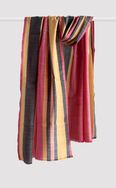 Regular price Rs. 4,800.00This design creates a visually captivating and harmonious blend of vibrant colours and texture. Featuring a series of asymmetrical stripes in hues seamlessly woven together adding depth and dimension to the shawl. Each piece is crafted using fine merino wool with a textured feel perfect for winter
