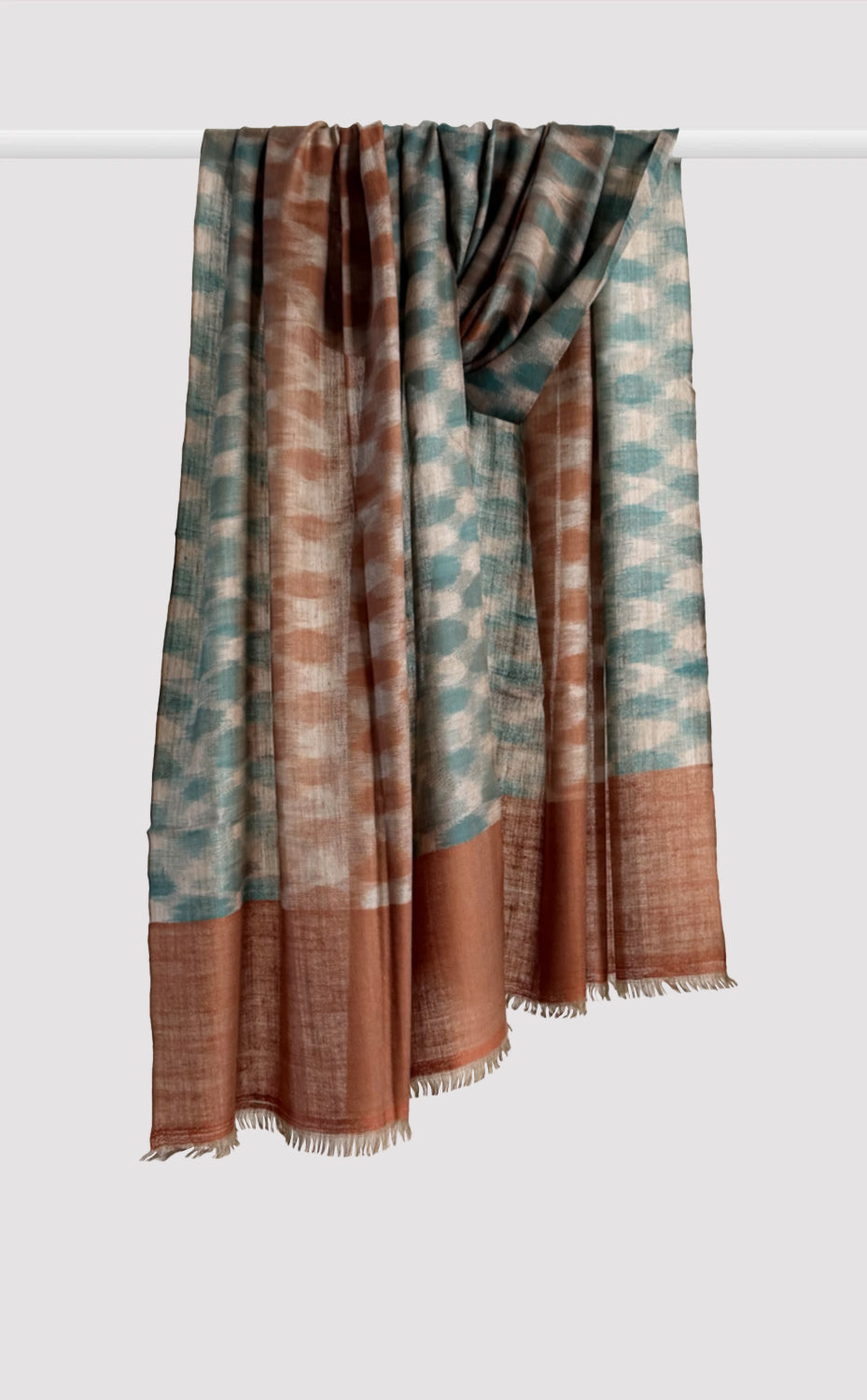 Regular price Rs. 20,000.00Made in Kashmir from natural & organically sourced wool pashmina, these stoles are pure and magical. The ultra fine fabric with rust green ikat stripes makes for an elegant stole for men & women